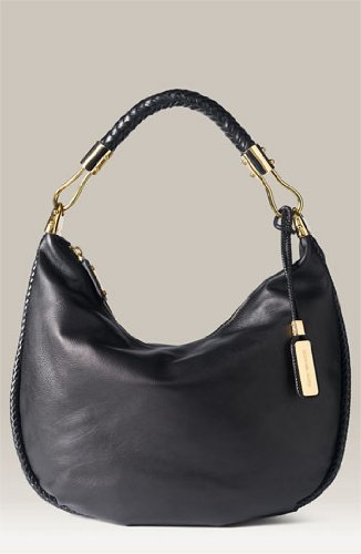 Exquisitely soft, the pleated leather on this Michael Kors Skorpios Pleated Leather Crescent Hobo Black Bag gives a rich look to an already opulent purse. Great looking braided strap and trim finishes it off with even more texture. Michael Kors signature hangtag in gold. Single leather shoulder strap with gorgeous Michael Kors engraved gold hardware at the base. Fits nicely over the shoulder with a 12 inch drop. You will be amazed at how comfortable this quality bag feels. Zip top opens to a taupe fabric interior with two side slip pockets and a side zip pocket. Measures 14(w) x 10.5(h) x 2(d).
